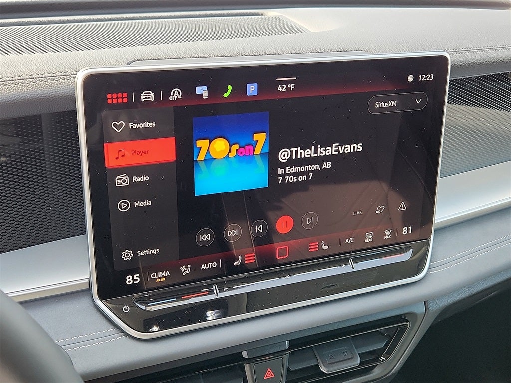 - Radio: MIB4 Composition Media Touchscreen AM/FM -inc: WMA/MP3/FLAC player w/USB, 12.9" touchscreen multi-function center display w/backlit sliders, voice control, 6 speakers + center speaker (7 speakers total) sound system, capability for in-vehicle 4G LTE enabled Wi-Fi (cellular data plan required; includes limited trial), capability for VW Car-Net services (capabilities for services vary; requires enrollment or subscription), Bluetooth® connectivity (for compatible devices), SiriusXM w/360L (w/3-month free trial subscription; 360L services require acceptance of Car-Net terms), App-Connect smartphone integration (w/Apple CarPlay, Android Auto and MirrorLink) via USB, wireless App-Connect smartphone integration (for compatible devices) w/multi-phone pairing capability, 45W fast charging (for compatible mobile phones and accessories) via USB in both rows and Qi wireless inductive charger, cooled, up to 15W (for compatible mobile phones and accessories)